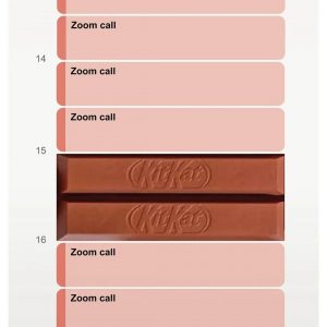 «Estaba desplazándome por mi calendario para ver cuándo podía hacer el briefing, y surgió la idea. “Si bloqueo esa sección”, bingo. Simplemente llené el espacio con un “bloque” de KitKat. Fue la imagen perfecta para mostrar por qué a todos nos encanta el chocolate. Muy rápidamente cuenta una historia de ese pequeño momento de tiempo para mí en un día agitado», cuenta Sam.