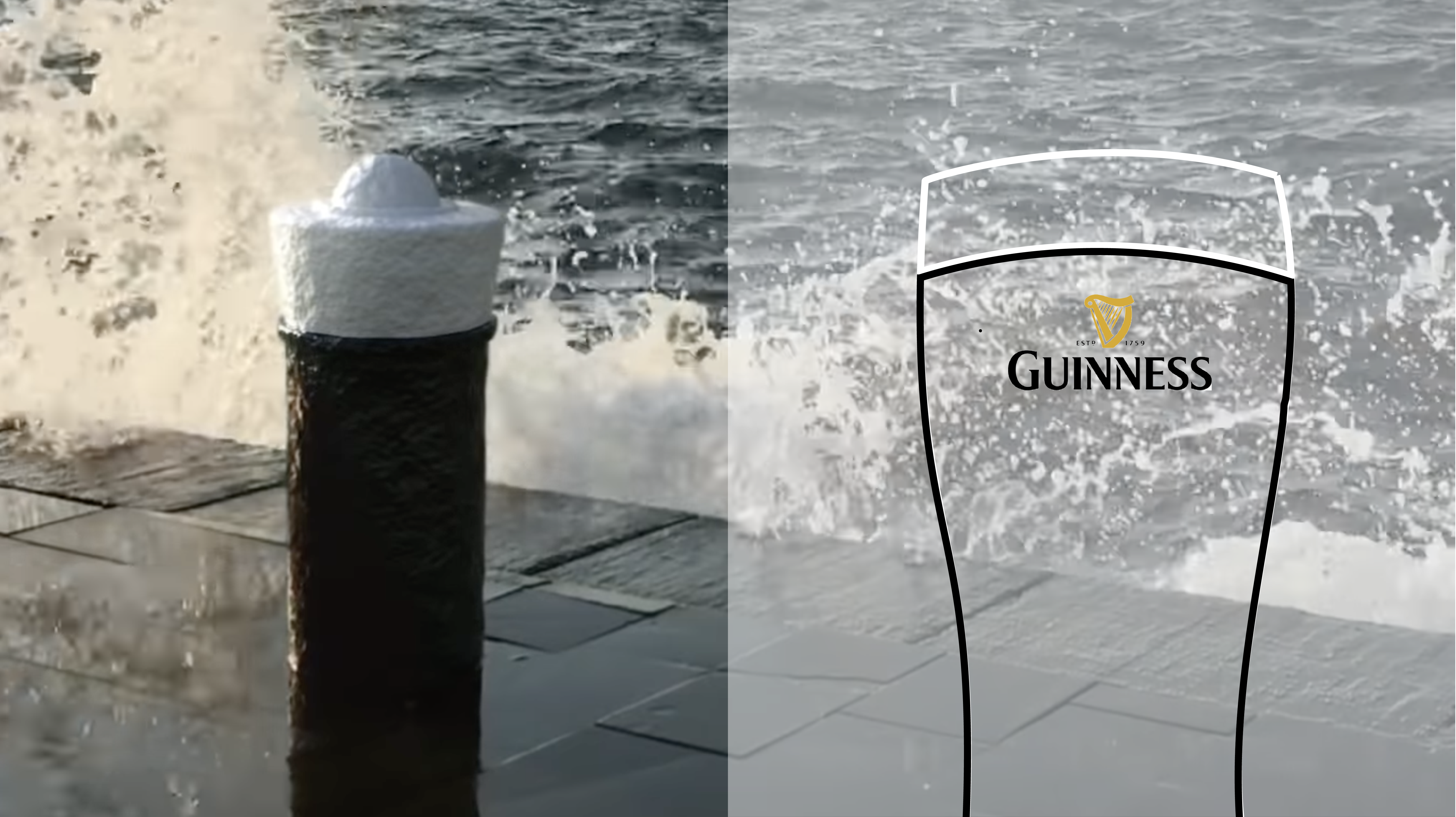 Por el anuncio desfilan una serie de objetos en blanco y negro que recuerdan (de manera más o menos remota) a la cerveza negra de Guinness coronada por su característica espuma blanca: un calcetines blancos y negros colgados de un tendedero, un gato blanco retozando sobre un cubo negro de la basura o un carrito negro de la compra del que asoma una bolsa blanca.