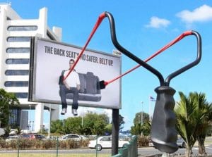 Roza el humor negro tal vez porque puede verse como un chiste el anuncio, al principio es algo que parece divertido. El anuncio llama la atención por cómo está hecho: utiliza las tres dimensiones ayudándose de una valla publicitaria urbana y un tirachinas. Una vez ya ha captado la atención de la gente tiene todo a favor para que su mensaje cale en la audiencia. El copy dice que «el asiento trasero no es seguro: átate». Y el tirachinas es demasiado gráfico: te hace una comparación con lo que podría pasarte si no lo llevas en caso de accidente. Salir disparado como un proyectil. Piel de gallina.