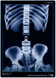 Hoy os traemos dos ejemplos gráficos de estos anuncios bestias. El primero es una campaña que se hizo en Australia para concienciar de la importancia del uso del cinturón de seguridad. Dicen que una imagen vale más que mil palabras y, en este caso, se cumple. Una radiografía te hace ver la importancia de usar el cinturón de seguridad: cómo un simple click puede salvar tu vida.
