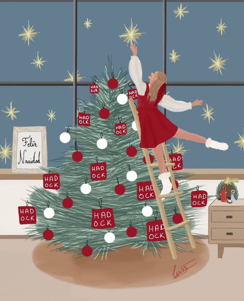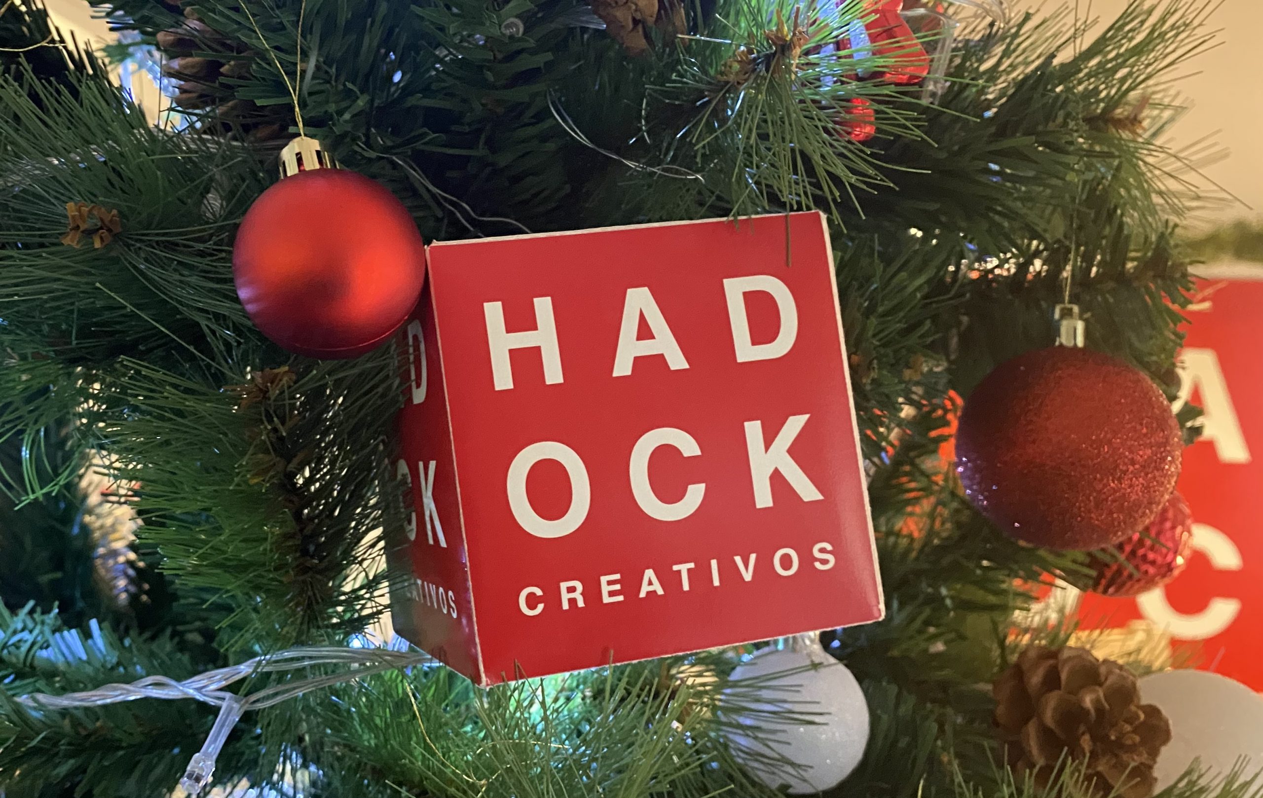 Doce de la mañana, me siento delante del ordenador dispuesta a escribir la ultima entrada del blog antes de navidad. Entro en google, investigo sobre las ultimas campañas de publicidad pero nada me llama la atención. Me levanto, me pongo un café y vuelvo. Sigo investigando con el mimo resultado que antes. Nada… nada lo suficientemente bueno para felicitar la navidad. Me vuelvo a levantar y comienzo a andar por la oficina, me fijo en la decoración navideña, paso al lado del árbol y no le doy importancia, voy al belén, paso por el office, me fijo en el espumillón y nada ¡Sigo sin ideas! Entonces por el rabillo del ojo veo unas cajas de Hadock que pusimos de decoración en el árbol y se me ocurre ¿Por qué no hacer un christmas de navidad?